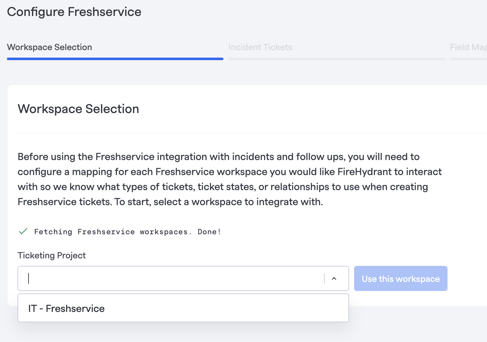 Under Incident Tickets, configure how FireHydrant should interact with incidents in Freshservice.