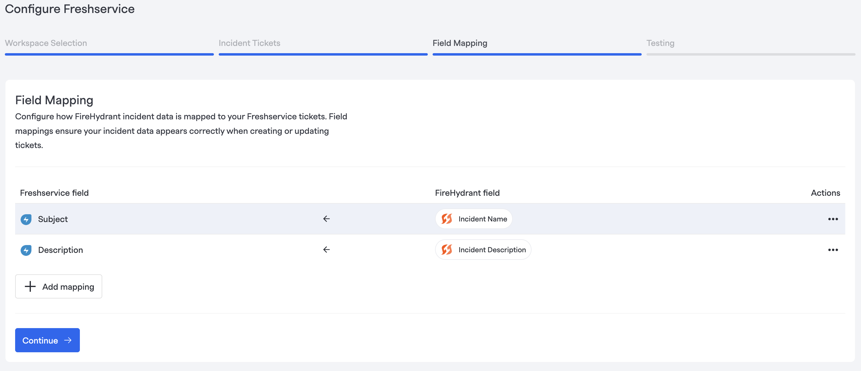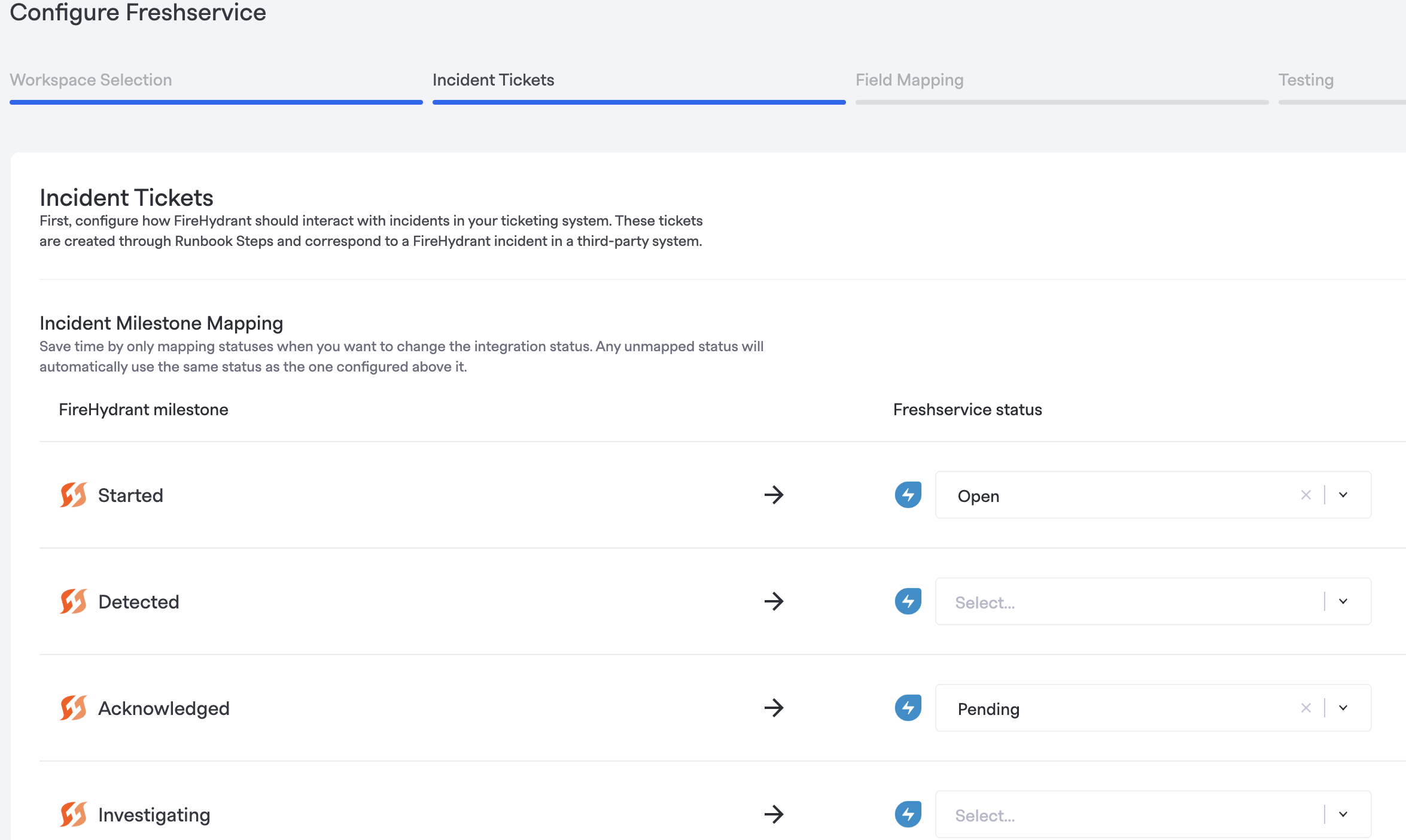 Under Field Mapping, configure how FireHydrant incident data is mapped to your Freshservice tickets.