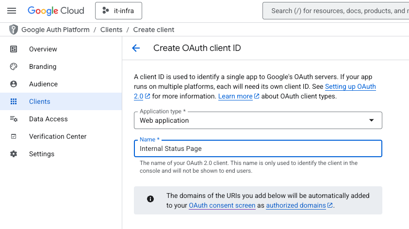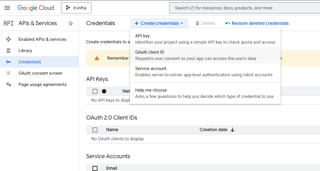 In a Google Cloud project that your users have access to, go to API and Services > Credentials and click Create credentials. In the dropdown, choose OAuth Client ID.
