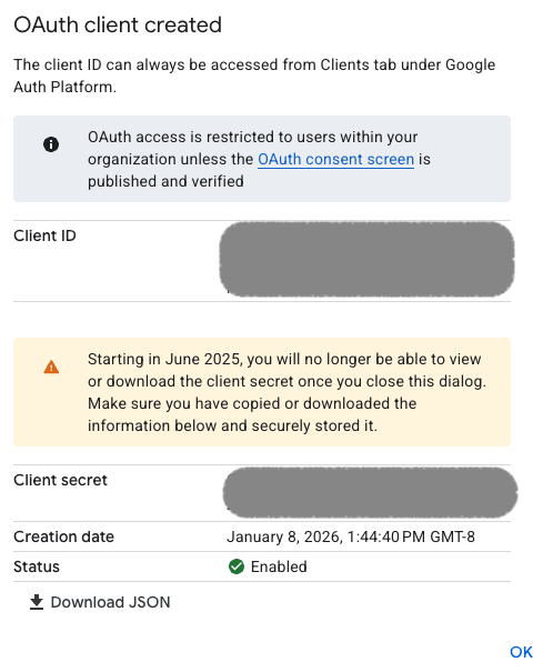 The following page will be your only chance to get the client secret, so be sure to copy this information before dismissing it!