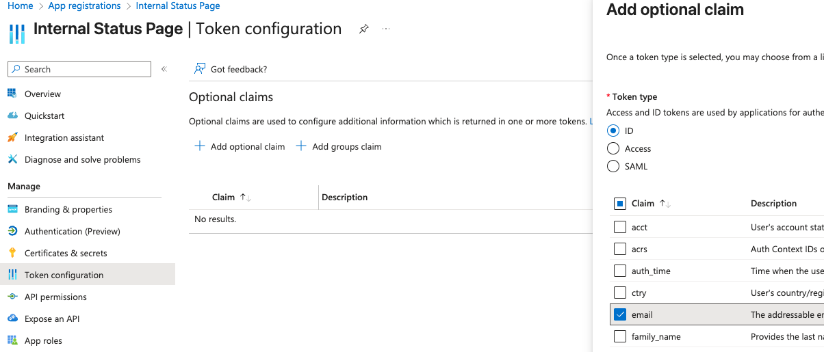 You will also need to add an optional claim. In the token configuration section, click the Add Optional Claim button. The token type is ID and the claim is email, as shown below.