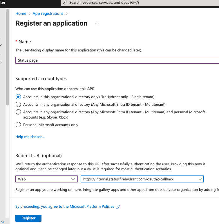 https://<statuspage hostname>/oauth2/callbackwhere<statuspage hostname>is the DNS name you chose when creating your status page. When you are finished, click Register to create the app.