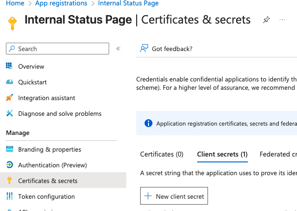 Once the app is registered, you will need to add a secret. In the Certificates and secrets section, click New Client Secret to add a new secret. Note that you will only be shown the secret once, so be sure to copy it somewhere immediately so you can enter it in the Firehydrant UI later.