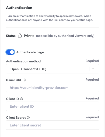 Note:We currently only support OIDC for SSO-authenticated status pages. In addition, this limits access to anyone in your organization who can login via SSO, not only users with FireHydrant licenses.