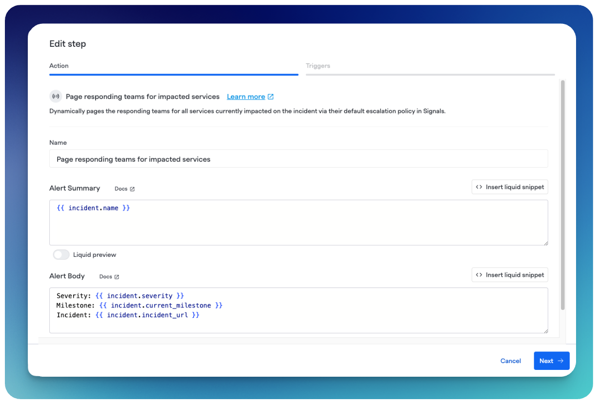 The Page Responding Teams for Impacted Services and Page Responding Teams for Impacted Functionalities Runbook steps allow you to automatically page the owning teams of any Services or Functionalities that are marked as impacted on an incident. Unlike the Page people via Signals step, no hardcoded targets are required. The step dynamically resolves the right teams at execution time using your Service Catalog.