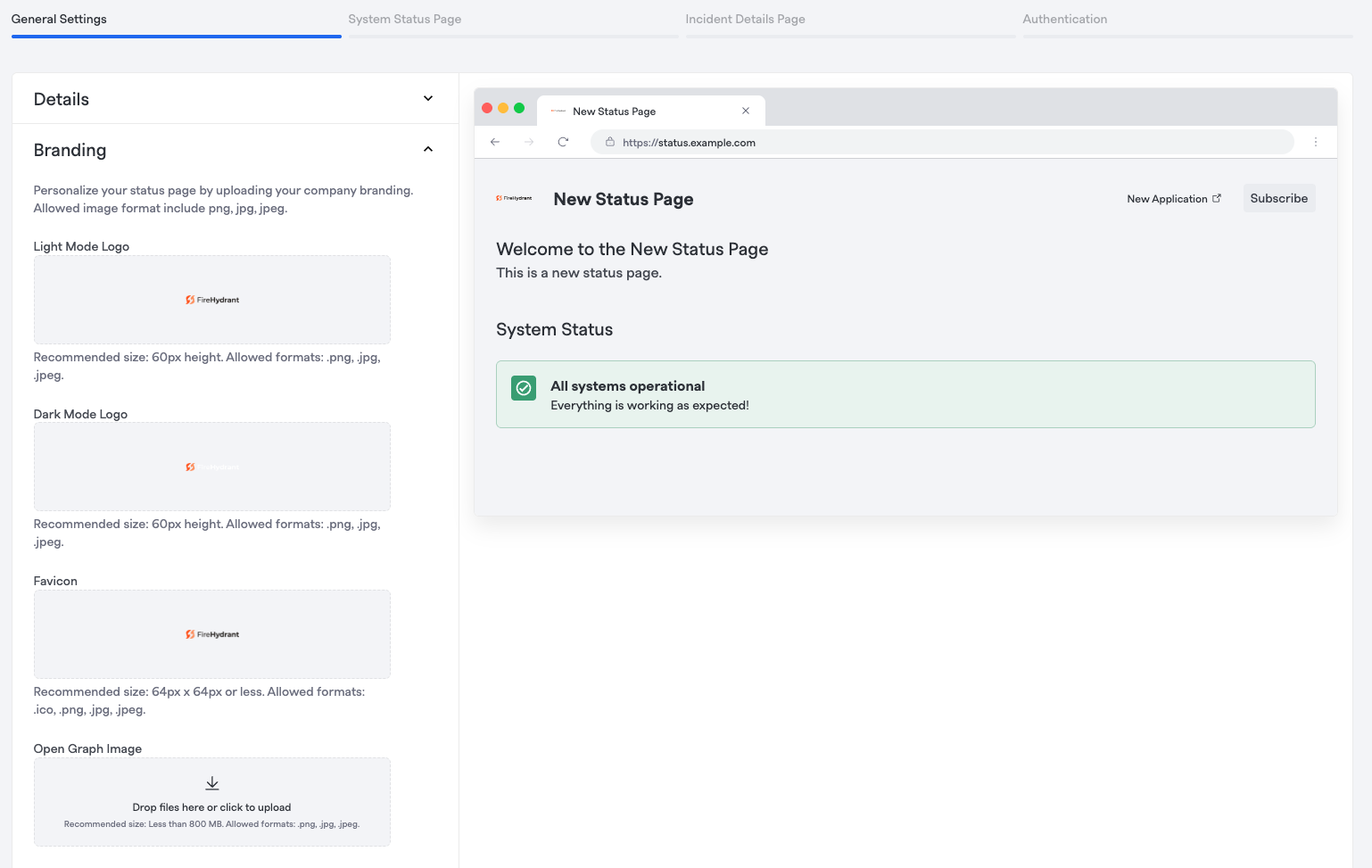 Open Graph Image | The image displayed in social media or link previews when linking the status page on other websites. Default is no image. |