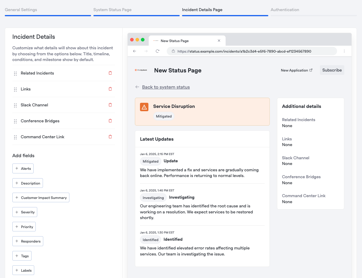 In the event of an incident, your viewers will also have the ability to follow incident updates on an incident specific status page. You may configure this page to include any number of incident fields on the right hand side.