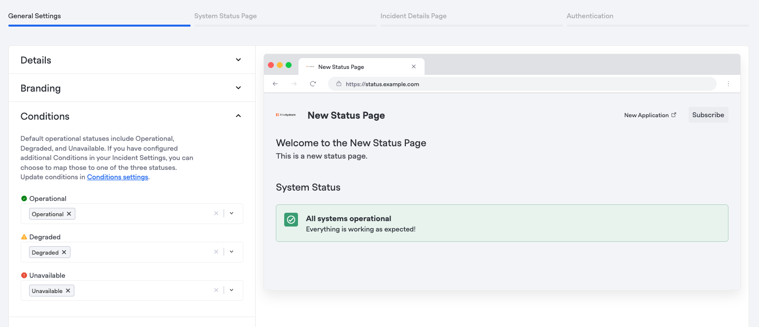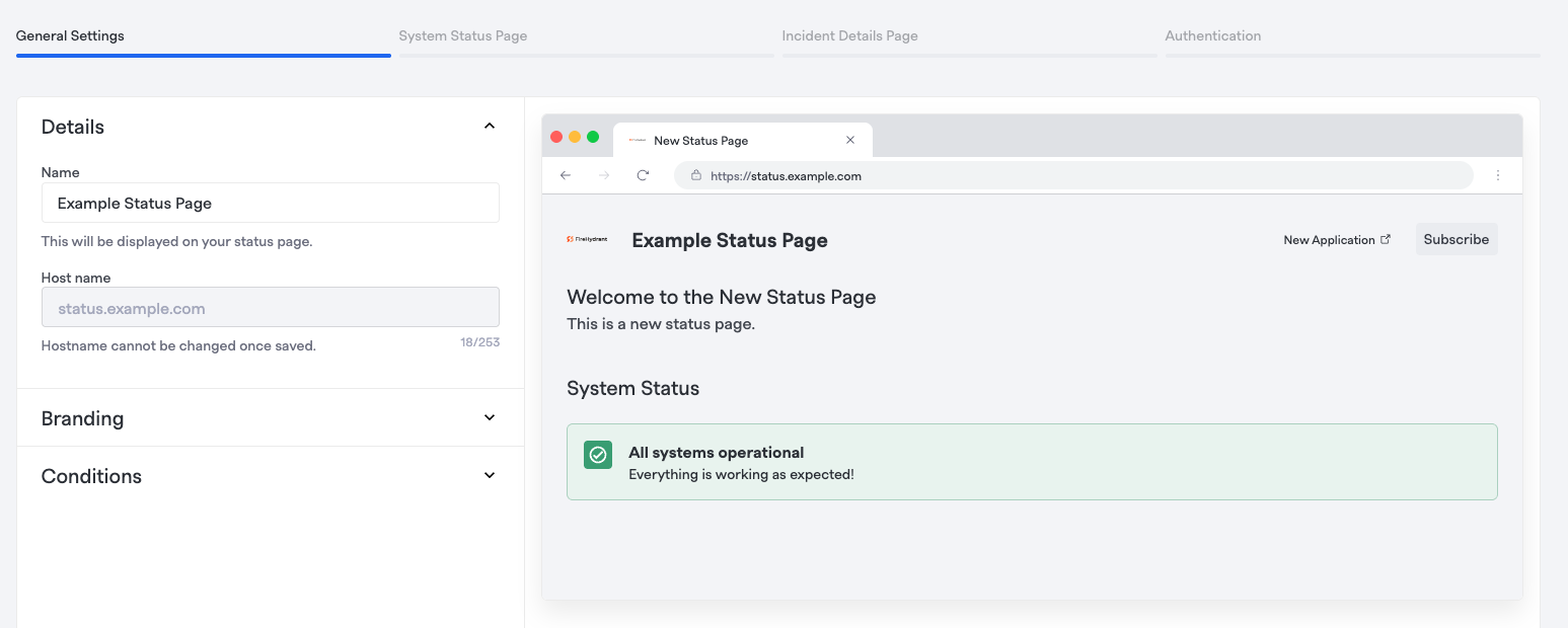 Within the General Settings tab of the status page setup, you will be setting the host name, branding to include your logo, and configuring the conditions to show on all created status pages.