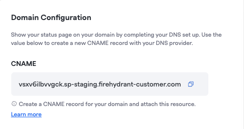 Note:FireHydrant's system automatically purges status page records after 2 weeks if CNAME records don't resolve. Please ensure you create the CNAME DNS record within 2 weeks of creating your FireHydrant status page.