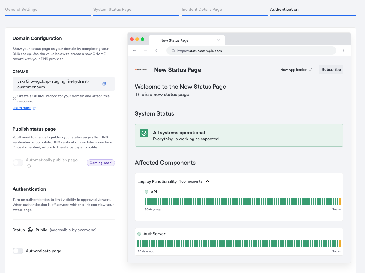 Note:If you have existing authenticated Status Pages, please reach out to our support team to transition to the new configuration.