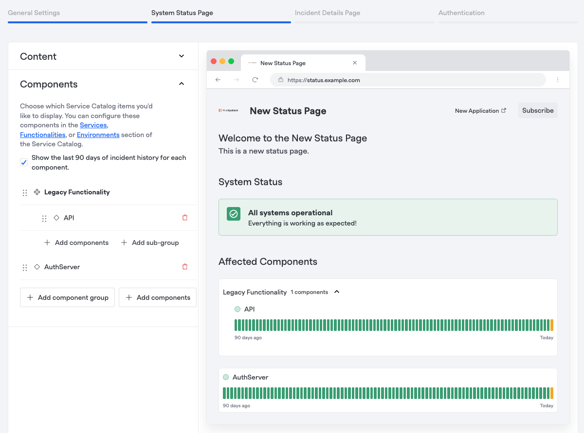 Designate which Service Catalog items you'd like to display on the status page. We typically see people show their Functionalities, but you can choose from Environments, Functionalities, or Services to display. You can add components to groups and subgroups to roll-up component conditions.