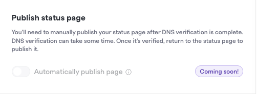 We will soon be enabling the ability for you to automatically publish new status pages upon DNS verification. When this feature is available, you will be able to enable this toggle and the created status page will be published and available as soon as the DNS record has been verified within our system.