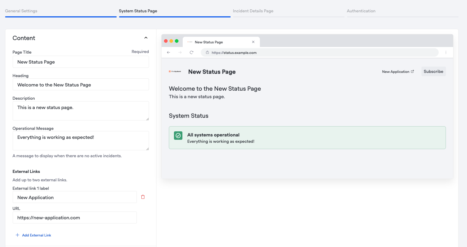 When users navigate to your status page, they will see an overview page, showing the current system status and the status of any configured components. Customize the system status page by configuring the following options.
