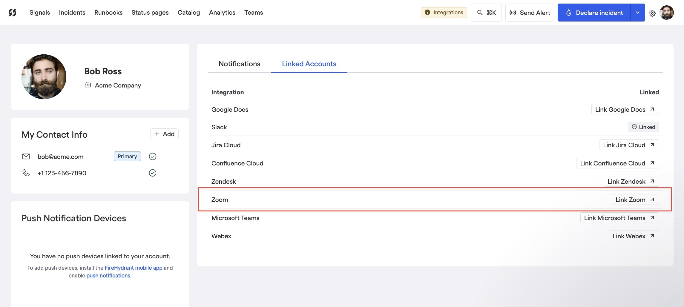 - On this page, scroll down to the Linked Accounts section and locate the Link Zoom button. This will take the user to another screen where FireHydrant requests additional permissions in Zoom (e.g., to create meetings as them). Once this is done, they should see a checkmark indicating their user accounts have been linked between the two platforms.